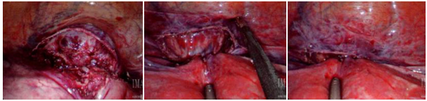 Surgical evaluation revealed an 8-week size, anteverted, mobile uterus with no additional masses; cervix was dilated to fingertip only. A 25mm skin incision was made in the umbilicus and a GelPOINT Mini advanced access single-site laparoscopy device was inserted. Abdominal insufflation revealed vesico-uterine adhesions limiting immediate visualization of the ectopic pregnancy. Due to poor visibility, intraoperative hysteroscopy was performed which revealed a gestational sac at the lower segment of the uterus, adherent to the anterior uterine wall approximately 3-4cm superior to the external cervical os. The RUMI manipulator was placed in the vagina without use of the uterine balloon. The vesico-uterine adhesions were lysed using the Harmonic scalpel and the ectopic pregnancy was exposed within the middle of the scar. Vasopressin was used for hemostasis and the Harmonic was used to incise this area; amniotic fluid with products of conception (POC) was noted and removed (Figure 1). Suction and graspers were used to remove as much POC tissue as possible. The RUMI manipulator was removed, and the endometrial tip was placed to ensure that the os was not closed during the repair. The uterine defect was closed in 3 layers using V-loc sutures (Figure 2). While maintaining observation with the abdominal camera, a suction D&C was performed. The diagnostic hysteroscopy, suction D&C, and SILS robotic resection of the CSEP was performed with an estimated blood loss of 30ml.