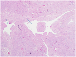 Figure 4 Pathology Slide: Congested ectatic capillaries (arrows) in the myometrium. (H&E stain).