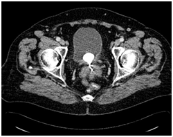 Figure 1 Pelvic computed tomography shows 3.0x 2.4 cm – sized bladder calculus in close contact with the IUD placed in the vaginal fornix.