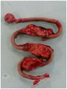 The patient was scheduled for an operation at our Department of Gynaecology. Due to the difficulty of IUD visualisation, total hysterectomy with bilateral salpingo-oophorectomy was done by laparotomy. Uterine surface was intact. During the opening of the vagina, it was visualised that the calcified IUD with its one part broke through the vagina and with the other part it was situated in the vaginal fornix. The IUD was extracted and the vagina was closed using single sutures. No leakage was observed after the bladder was filled with 200 ml methylene blue. The operation was concluded (Figure 2).