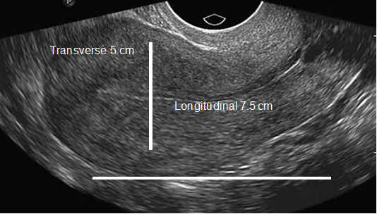 Figure 1 An ultrasound image of the uterus showing normal size. The horizontal line shows longitudinal measurement (7.5 cm), and the vertical line shows transverse measurement (5 cm).