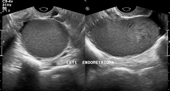 Figure 3a An ultrasound image of the uterus showing left endometrioma. The dots indicate size of masses present.
