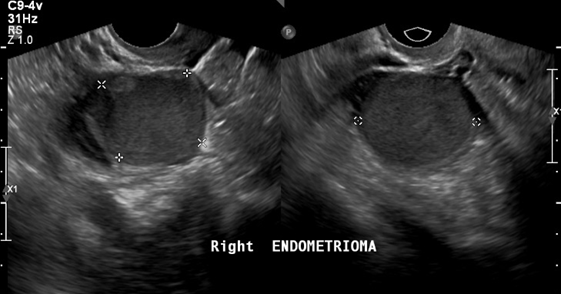 Figure 3b An ultrasound image of the uterus showing right endometrioma. The dots indicate size of masses present.