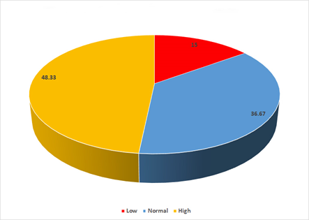 Figure 4 Estrogen levels in all patients participating in this study regardless of endometriosis. In this study, high estrogen levels were observed in 48.33 %, normal in 36.67 % and low in 15%).