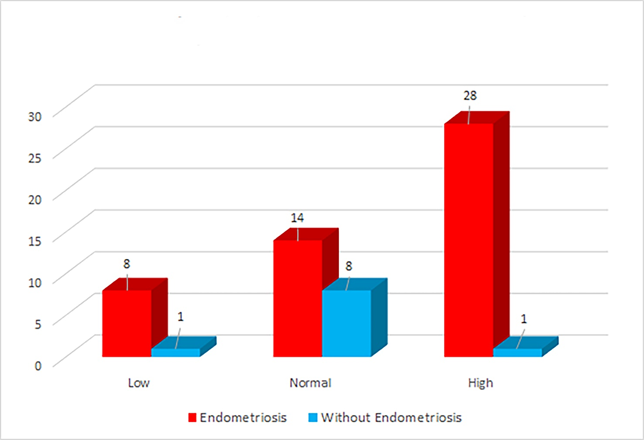 In the endometriosis group, 28 patients had high estrogen levels and only 14 had normal levels, while the patients in the control group without endometriosis, only one patient had high estrogen level, and 8 had normal estrogen level (Figure 5).