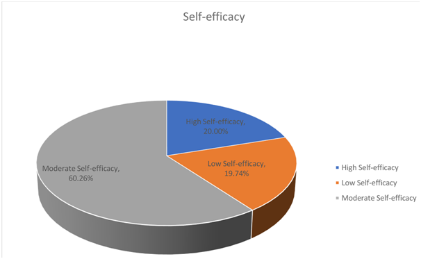 From Table 3, three levels of self-efficacy were identified, 60.26% had a moderate level of self-efficacy, 19.74% had low self-efficacy and 20.00% had high self-efficacy. These were represented in Figure 1.