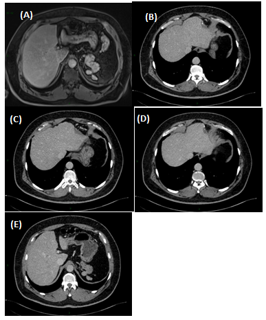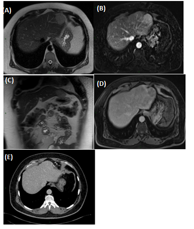 T2-weighted (A & B) and T1-post-contrast (C, D and E) images, in axial (A, C, D and E) and coronal (B) planes, that demonstrate subcapsular nodule in liver segment II, with intermediate sign in T2, enhancement in the post-contrast arterial phase (C) and washout with capsular enhancement in the venous phase (D). Signs of splenectomy and small implants of splenic tissue in the left subphrenic region (E) are also noted.