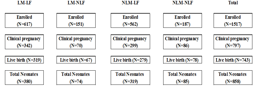 The sample size in the present study was based on that this is a single group cohort study that included 1517 women who were prepared for ICSI collected from a Aljazeerah hospital IVF center in the period from February 2016 till March 2018 and gave birth to 858 neonates, the neonates were classified according to the corresponding males and females (parents) BMI into lean male& lean females (LM-LF) (N=318, 44.3%), lean male& non-lean female (LM-NLF) (N=74, 8.6%), non-lean male& lean female (NLM-LF) (N=319, 37.2%) and non-lean male non-lean female (N=85, 9.9%), so sub grouping numbers were by chance according to their proportion in the single group cohort who were seeking ICSI and fulfilling the criteria and enrolled in the study in the period from February 2016 till March 2018 .