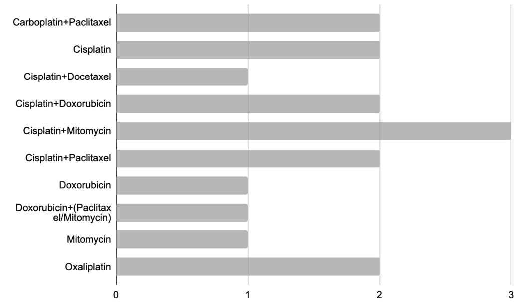 As far as the HIPEC regimens were concerned, most frequent reference was to the combination of Cisplatin Mitomycin (3 references), followed by Carboplatin Paclitaxel, Cisplatin, Cisplatin Doxorubicin, Cisplatin Paclitaxel, Oxaliplatin (2 references each), as well as Cisplatin Docetaxel, Doxorubicin, Doxorubicin (Paclitaxel/Mitomycin), Mitomycin (1 reference each) (Figure 1).