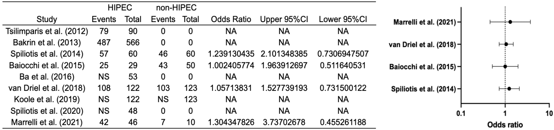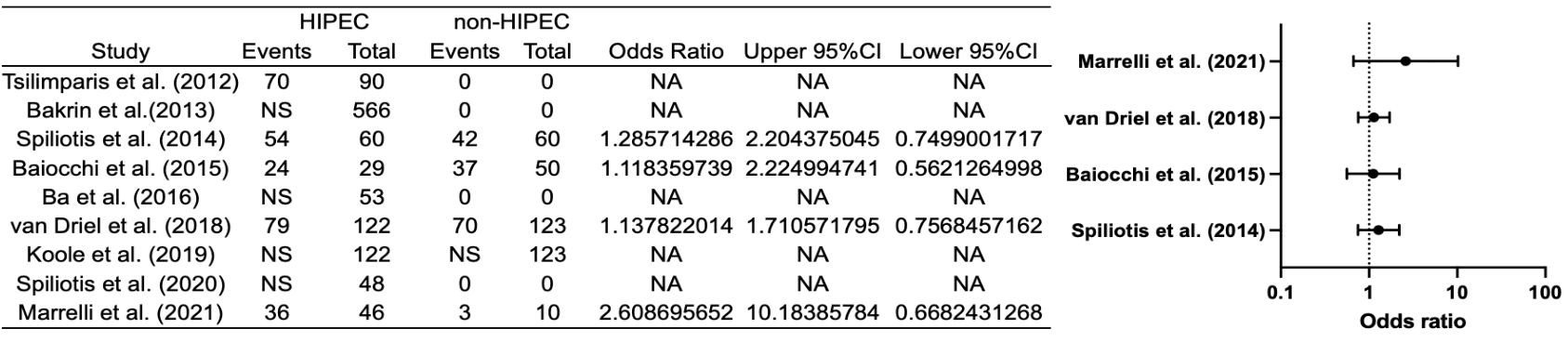 Results: Data decoding revealed a notorious improvement of OS of the cytoreductive surgery (CRS) plus HIPEC versus the CRS arm at 1, 3, 4 and 5 years respectively; (OR 1.10; 95% CI, 0.85-1.43), (OR 1.53; 95% CI, 1.12-2.10), (OR 1.70; 95% CI, 1.03-2.81), (OR 1.22; 95% CI, 0.77-1.95). At 2 years, the collected data depicted a small worsening in OS (OR 0.92; 95% CI, 0.70-1.19).