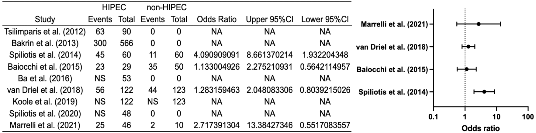 Le Brun et al. reveal a substantial difference in OS at 4 years in the HIPEC versus the non-HIPEC arm (75.6% vs 19.4%).26