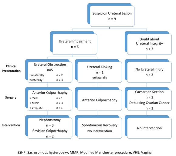 The study design concerning the attribution of ureteral injuries with surgical procedures and interventions is shown in Figure 1. A potential postoperative lesion of the ureter, which was an item in 9 patients after surgery, was confirmed in 6 patients, all of whom were treated with anterior colporrhaphy, usually in addition to other surgical measures.