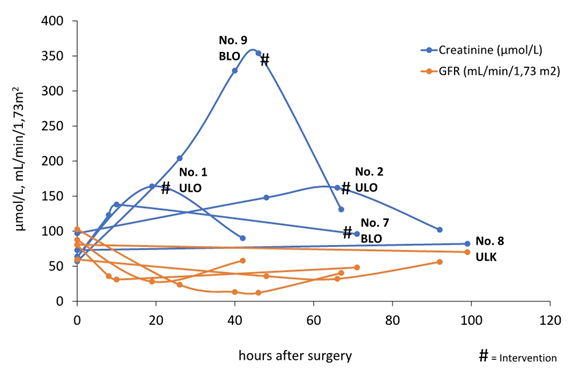 The analogous values in patients without intervention were measured in a comparable time frame after surgery (29±25 hours, p=1.00) and showed no significant changes. In 2/3 cases, postoperative serum creatinine concentration decreased slightly. In the one case with unilateral kinking of the ureter (patient no. 8), a small increase in creatinine was detectable (9µmol/L=0.1mg/dL) with a corresponding decrease in GFR.