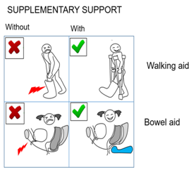 Why for sling surgery, an evidence based intervention can end up in such a big catastrophic complication? Mesh or sling is a synthetic non-stretchable material that holds up the urethra or pelvic organ to correct the UI or POP symptoms. During defecation while the rest of pelvic floor is descended during defecation, the surgical site is loaded more then what it can hold. In early post-operative period, prognosis is usually good, but as time passed with aging and straining due to constipation, the rest of pelvic floor descend to overload the surgical site. The synthetic material does not fail to support but only the supported site gradually erode and migrate and cause excruciating pain when the synthetic material touch the nerve plexus. This has led to world largest medical complications, involving billion dollar lawsuit. The worse is yet to come, as urogyn ecologists are yet to find a reliable solution. Reconstructive surgery with sling and mesh for UI and POP are based on similar concept to strengthen anterior and middle segment of pelvic floor support that responsible for pathogenesis of UI and POP. The associated chronic constipation which is due to weakness and sagged posterior part of pelvic floor remains uncorrected. The prognosis of the pelvic floor reconstructive surgery should be better if straining during defecation and the loading of surgical site can be prevented. This is based on well accepted old concept of supplementary support to prevent overloading of reconstructed support: Orthopedic surgery for lower limb would face the similar scenario as sling surgery for UI if there are no crutches or walking aid to provide supplementary support to allow optimal healing of surgical site (Figure 1).