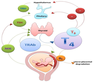 Pregnancy is a complex endocrine condition and has modified immunologic response, pregnancy exerts stress effect on the thyroid as there is needful rise for metabolic rate in response to changes in body weight, composition, plasma volume and cardiac output which are critical for fetal growth throughout the pregnancy. It carries multivariate effects on thyroid gland and hormone homeostasis. The gland might increase in volume by 10-15% (might be undatable clinically, but could be by highly sensitive ultrasound), some women might be goitrous especially in iodine-deficient regions, and near 50% increase in hormones production.