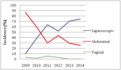 From 2009 to 2014, 296 hysterectomies were performed. Of these 161(54.4%) were performed laparoscopically, 128 (43.2%) were performed abdominally and 7(2.4%) vaginally. During this period the rate of TLH increased approximately sevenfold from 10% to 75%, while the rate of TAH fell from 87% to 25%. The rate of vaginal hysterectomy (VH) remained low at 0 to 5.7% (Figure 1). Due to the low VH rates, the data was excluded from comparison and further statistical analysis. Baseline characteristics between the 2 groups were comparable (Table 1). Pain was the most common indication for surgery in the laparoscopic group (42.2%) while heavy menstrual bleeding (HMB)/irregular bleeding predominated in the abdominal group (68.8%) (Table 2).