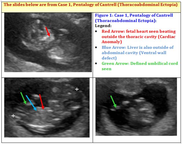 Cases: Case 1 - pentalogy of Cantrell: A 33 year old woman, G2P1001, presented to clinic initially at 6 weeks and 5 days gestation for her first dating bedside ultrasound. The patient was treated for pregestational hypertension with methyldopa 500 mg three times per day (TID) but she declined its use. She agreed to the use Labetalol 200 mg TID as hypertensive therapy. A follow up first trimester ultrasound at 12 weeks and 6 days gestation showed the fetal heart beating outside to the thoracic cavity and the liver outside the abdominal cavity. The radiology impression was a ventral wall defect indicating likely Pentalogy of Cantrell. The patient was counseled about the very poor fetal prognosis and incompatibility with extrauterine life. She wished to proceed with pregnancy termination and underwent voluntary termination of pregnancy (VTOP) via dilation and curettage at 13 weeks and 6 days gestation.