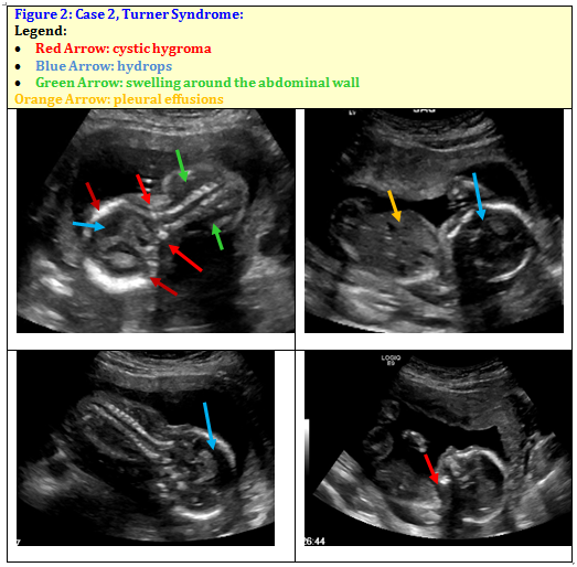 Case 2 - turner syndrome: A 42 year old Caucasian female, Rh negative/antibody negative, G5P3013, at 15 weeks and 3 days gestation by last menstrual period (LMP) presented to our clinic for her first obstetric ultrasound. Bedside ultrasound showed a live intrauterine pregnancy and a corrected gestations age of 16 weeks 0 days and swelling around the abdominal wall and fetal head. The MFM ultrasound at 17 weeks 3 days gestation revealed fetal demise (FD), cystic hygroma and significant hydrops fetalis with bilateral pleural effusions and ascites. As the antibody screen was negative, the likely etiology was nonimmune hydrops most likely due Turner syndrome (45XO). The patient was induced with 400 mcg of Misoprostol vaginally every 6 hours until delivery of a stillbirth female fetus.