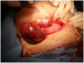 These findings were interpreted to represent a case of right ectopic pregnancy. The patient was prepared for the termination of pregnancy by laparotomy. Her hemoglobin (Hg) level was 9g/dL.