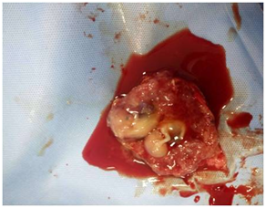 Laparotomy through a Pfannenstiel incision was performed under spinal anesthesia after counseling the patient about her current condition and obtaining an informed consent from her to carry out the procedure. There was mild hemoperitoneum with normal uterus and left adnexa. Right fallopian tube was markedly distended through its whole length, but interestingly it was intact with no evidence of any rupture in the tubal wall. Right salpingectomy was performed. The tube contained two embryos in two separate gestational sacs. No intra-operative blood transfusion. The patient had an excellent postoperative course and was discharged on day 3 post-operation (Figures 1 & 2).