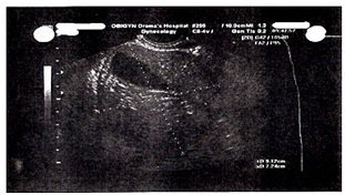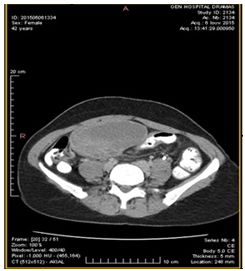 A new abdominal ultrasound (Figure 1) confirmed the presence of cyst in the right ovary. Computed Tomography (CT) scans were used for further staging and pre-operative evaluation of the mass.