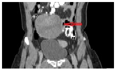 Figure 3 CT abdomen (coronal plane) shows the cyst presence in the right ovary (10,5 cm×7cm sizes) with solid and cystic elements. The red arrow indicates the lesion.