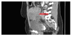 Figure 4 CT abdomen (sagittal plane) shows the cyst presence in the right ovary (10.5cm×7cm) with solid and cystic elements. The red arrow indicates the lesion.