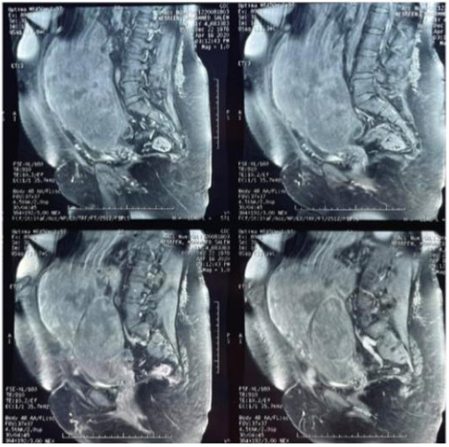 Investigations, Magnetic resonance Imaging (MRI) scan findings were suggestive of a large Lobulated masses compressing intestinal loops , arising from the uterine stump and extending into the abdomen, measuring 30×24 x 13 cm, adherent to both bowel and bladder (Figure 2) (Figure 3). CA125 was 132.3ng/mL (0-35ng/mL), LDH was 1127 (140-280U/L), the remain results were normal, and the patient was prepared for Mid-line exploration.