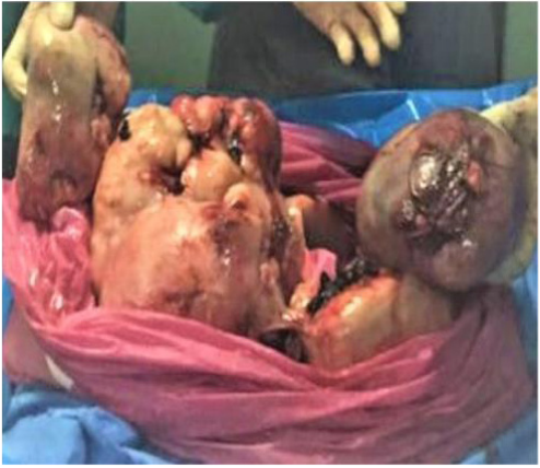 Intra-operatively, through Mid-line exploration, the abdomin-pelvic cavity was completely obliterated with huge lobulated highly vascular masses (Figure 4) (Figure 5).