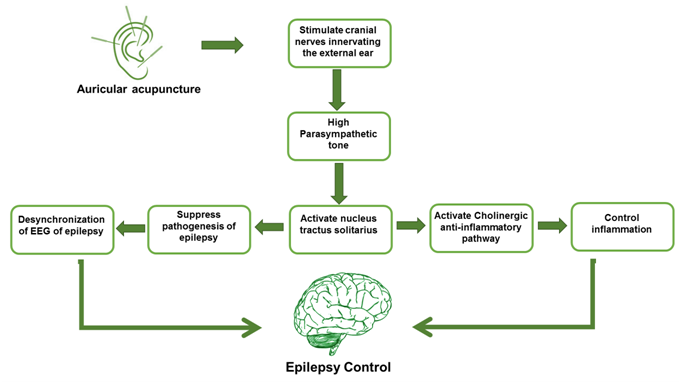 Acupuncture for the treatment of epilepsy dates back manyyears and is currently on the rise among epileptic patients with some reporting a reduction in seizure frequency as a result.41 Figure 3 illustrates the possible mechanism of auricular acupuncture for the treatment of epilepsy. According to Cheuk and Wong in a Cochrane review that included 17 randomized controlled trials (RCTs) with 1538 participants of many ageswho were suffering mainly from generalized epilepsy, acupuncture was said to possess no adverse effects towards epileptic patients.42 However, the included trials were small, heterogeneous and had a high risk of bias. It remains uncertain whether acupuncture is effective and safe for treating people with epilepsy. Hence, current evidence does not support acupuncture as a form of epilepsy treatment.42 In addition to that, another higher quality Norwegian trial documented no beneficial outcomes from acupuncture, with no improvement in the mean seizure frequency, seizure-free weeks, or quality of life in adults.41
