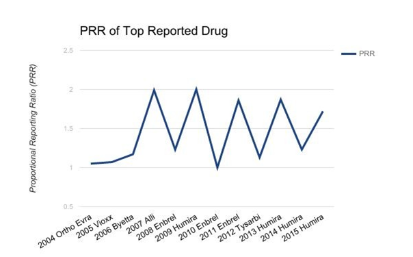 The top reported drugs from 2004 to 2015 include Ortho Evra, Vioxx, Byetta, Alli, Enbrel, Humira, and Tysabri. The rate of patients who were exposed to the medication and experienced an adverse event ranged from 1.00 to 2.00. This relative ratio shows that each drug was specific to a particular adverse event. The results are charted below Figure 1.