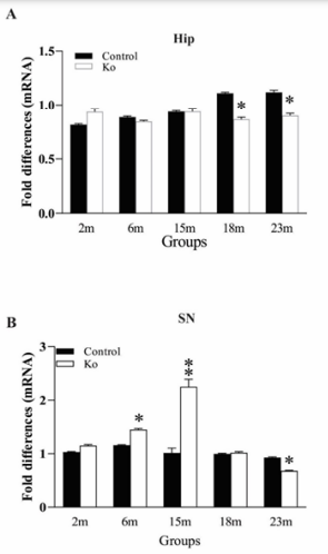 Figure 3 VMAT2 Lo mice have increased mRNA levels of OGG1 in the Hip (A) and SN (B) at 2, 6, 15, 18 and 23 months of age, measured by qPCR (N=5 mice/group). * p<0.05, ** p<0.01, compared to the control. See Fig. 1 for abbreviations.