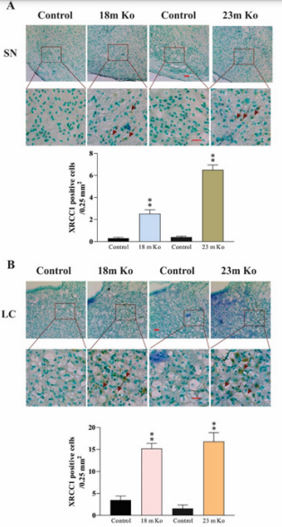 Figure 8 VMAT2 Lo mice showed the immunoreactive levels of XRCC1 in the SN (A) and LC (B), compared with that in age-matched controls, as determined by IHC analysis (n = 6 mice/group). Upper panels in A and B: representative images of IHC staining, and red arrows indicate positive XRCC1 amounts (brown). Lower panels in A and B: subsequent quantification. Scale bar= 25 μm. The values are presented as means ± SEM. ** p < 0.01 versus control group. See Fig. 4 for abbreviations.