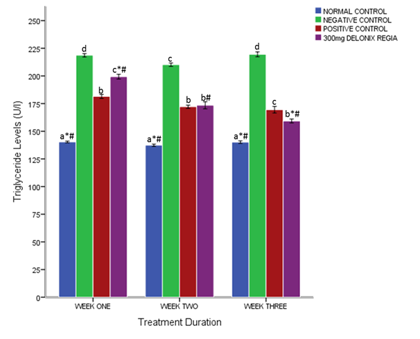 Figure 2 Effect of aqueous seed extract of delonix regia on Triglyceride levels of male wistar rats.