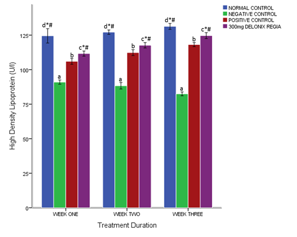 Figure 3 Effect of aqueous seed extract of delonix regia on High Density Lipoprotein levels of male wistar rats.