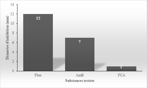 The inhibition diameter of Fhex, Faqf partitions and AmB, FCA and 5FC antifungals which are 14mm, 11mm, 12mm, 14mm and 16mm respectively, are above the sensitivity threshold of 10mm unlike Fdcm partitions and Face which have respective inhibition diameters of 9mm and 7mm.