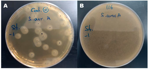 Figure 1 In vitro antimicrobial effect. A) Positive control plate after 48 hours of anaerobic incubation at 37ºC; B) Inoculated product plate after 48 hours of anaerobic incubation at 37ºC.