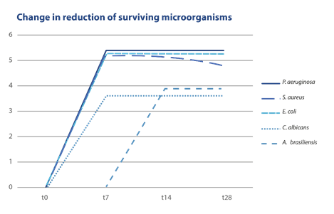 All experiments met the criteria for log reduction of surviving organisms at the established times. The log reduction at 8 days, 14 days and 28 days was 5.39 at all times for P. aeruginosa, 5.28 for S. aureus, between 5.18 and 4.88 for E. coli, from 4.59 to 3.59 for C. albicans and from 4.88 to 3.88 for A. brasiliensis (Figure 2), thereby satisfying criterion A established according to ISO 11930 that demonstrates the effectiveness of the product’s preservative system.