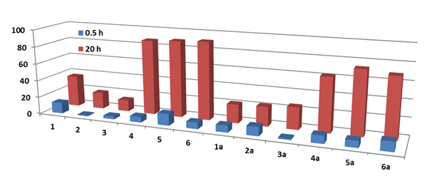 Figure 9 Comparison of the amount of reduced DPPH (%) in the presence of compounds 1-6 and 1a-6a on 0.5 h and 20 h.