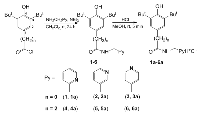 A mixture of NEt3 (77 μl, 0.55 mmol) and corresponding picolylamine (52 μl, 0.5 mmol) in degassed CH2Cl2 (1 ml) was added dropwise to a solution of 3,5-di-tert-butyl-4-hydroxybenzoic acid chloride (137 mg, 0.5 mmol) or 3-(3,5-di-tert-butyl-4-hydroxyphenyl)propionic acid chloride (148 mg, 0.5 mmol) in degassed CH2Cl2 (20 ml) and reaction mixture was stirred for 24 h. Solvent was removed in vacuo, residue was washed by petroleum ether (3x5 ml) and H2O (3x5 ml) and dried in the air.