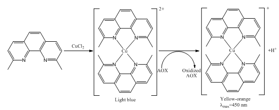 Capability of the compounds to abstract one-electron makes them the potential antioxidants. The one-electron transfer capacity of compounds was examined as Cu2+ complex with 2,9-dimethyl-1,10-phenanthroline (neocuproine) reducing ability in method proposed by Apak et al. (Scheme 4).36 Antioxidant activity of compounds is compared to standard antioxidant trolox (6-hydroxy-2,5,7,8-tetramethylchroman-2-carboxylic acid) as an analogue of α-tocopherol. While Cu2+ complex is light blue the reduction with antioxidant changes its color to yellow orange with λmax at 450 nm that can be detected spectrophotometrically.