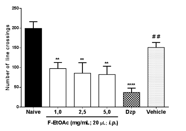 Figure 2 Effect of Et-EtOAc the EtCNeem under the locomotor behavior of zebrafish (Danio rerio) adult in the Open Field Test (0-5 min). F-EtOAc – Fraction ethyl acetate; Dzp – Diazepam (1.0 mg/mL, i.p.); Vehicle (DMSO 3%). Values represent the mean ± standard error of the mean for 6 animals/group; ANOVA followed by Tukey ****p<0.0001, **p<0.01 vs Naive; # #p<0.01 vs Dzp.