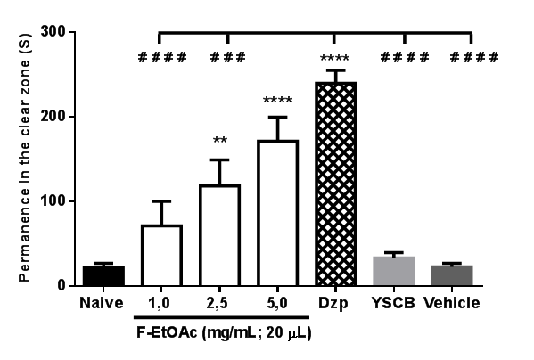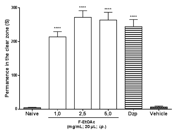 The F-EtOAc (1.0 or 2.5 or 5.0 mg/mL; i.p.) and Diazepam (1.0 mg/mL; i.p.) increased (****p< 0.0001 vs naive or vehicle) the permanence in the light zone of the Light & Dark Test (F5, 30 = 60.4; Figure 3).