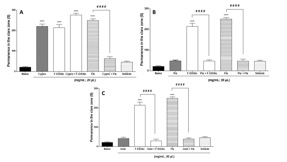 Figure 4 Anxiolytic-like effect of F-EtOAc after pretreatment with cyproheptadine (A), pizotifen (B), and granisetron (C) in adult zebrafish in the light/dark test (0–5 min). Naive, untreated fishes; Cypro, cyproheptadine (0.8 mg/mL; 20μL; p.o.); Piz, pizotifen (0.8 mg/mL;20μL; p.o.); Gstn, granisetron (0.5 mg/mL; 20μL; v.o.). F-EtOAc (1.0 mg/mL; 20μL; i.p.); Flx, Fluoxetine (1.25 × 10−3 mg/mL; 20μL; i.p.); Vehicle: DMSO 3% (20μL; i.p.). Values are presented as group mean±} S.E.M. Differences between the groups were determined by ANOVA followed by Tukey’s post hoc test. Significant differences: ****p< 0.0001 vs. naive or vehicle; # # # #p< 0.001 vs. Flx or F-EtOAc.
