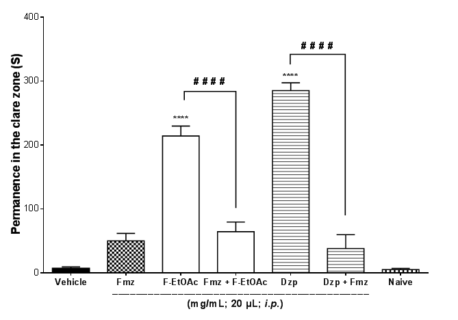Flumazenil reduced (# # # #p<0.0001) the anxiolytic-like effect of F-EtOAc (1.0 mg/mL; i.p.) and of Diazepam (1.0 mg/mL; i.p.) (F6,35 = 68.49; Figure 5).