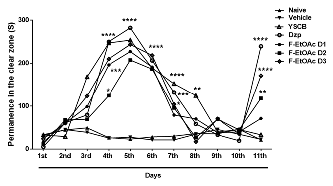 YSCB (38%; 20μL; p.o.) caused an anxiolytic-like effect from the 4th to the 5th day (****p<0.0001 vs. naïve or vehicle; F6,385=58.63) of treatment. This effect was also observed during three days of abstinence: on the 6th and 7th day (****p<0.0001); on the 8th day (**p<0.01) (Figure 6). F-EtOAc (5.0 mg/mL, i.p.) significantly prevented (****p<0.0001) alcohol-withdrawal induced anxiety in adult zebrafish on the 11th day, significantly similar to the effect of Diazepam (Dzp; 1.0 mg/mL; i.p.; ****p<0.0001; F6,35 = 16.86), Figure 7.