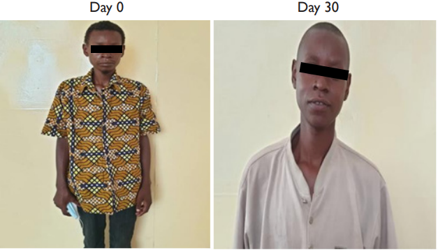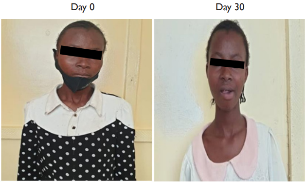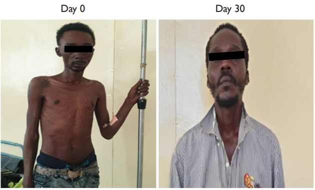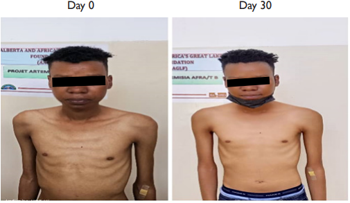 One patient however deserves a particular attention. Patient no 032 IK HA 03.22 was admitted at Heal Africa Hospital on March 13, 2022, with the following symptoms: persistent diurnal and nocturnal cough, asthenia, aphonia, extreme weight loss and lack of appetite (see attached picture). He was put on IVs and oxygen therapy under strict 24 hours monitoring. The next morning, he was given Artemisia infusion and the WHO tablets and after 3 days, there was a significant clinical improvement. He recuperated his appetite and started feeling much better. It is important to note that this patient has been on WHO tablets for 77 days and that his health had significantly deteriorated prior to his enrolment in our study. It is also important to note that his lungs x-ray improved significantly after treatment as we can see on the attached X-ray reports. Finally, as we can notice on the Ziehl Neelsen sputum smear there were several KOCH bacilli on Day 0 and none on Day 30(see picture below).