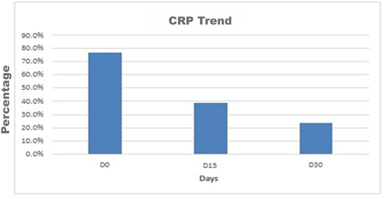 Although very expensive and mostly unavailable in most poor countries, we run this lab test to ensure that we will be closely following its trend as an additional tool for diagnosis and treatment follow up. Values higher than 10 mg/Liter suggest an inflammation.10 This table shows the CRP trend for our patients. It is interesting to note that the CRP value is decreasing as the healing progress is taking place. According to the approved protocol it is the Ziehl Neelsen test that was the sole criterium to confirm that the patients were healed.