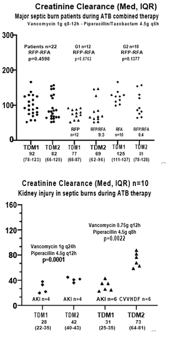 Keywords: vancomycin-piperacillin/tazobactam combined therapy, ICU major septic major burns, pharmacokinetic changes impact, PK/PD approach in a real time, target attainment based on cultures-serum levels