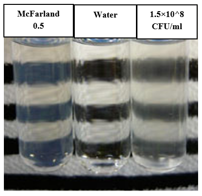 Each strain was suspended in a 0.9% NaCl solution until it reached 0.5 McFarland standards. This was achieved by measuring transmittance using a UV-Vis spectrophotometer. McFarland standards were used to standardize the approximate number of microbes in the liquid suspension by visually comparing the turbidity of microbial suspension with the turbidity of 0.5 McFarland standard as in Figure 1 and was prepared as follows: 85 ml of 1% (v/v) sulfuric acid was added into a 100 volumetric flask. 0.5 ml of 1.175% barium chloride solution was added drop wisely to the above flask with continuous swirling and stirring. The volume was completed to 100 ml by 1% (v/v) sulfuric acid. The optical density (amount of light scattered by bacteria) was measured at 625nm and should be in the range (0.08-0.1).